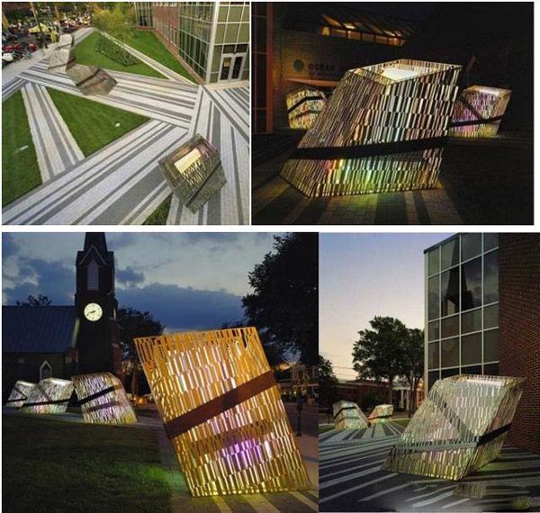 美國Mikyoung Kim完成了新澤西州海洋縣公共圖書館門前的一系列景觀照明設(shè)計。這個由激光切割不銹鋼和玻璃構(gòu)成的景觀燈具,應(yīng)用了條碼圖案來表達(dá)在數(shù)字時代下信息的傳播。五個一組的燈具被用激光切割成的鋼鐵包裹在一起,它們既能反射光線,又能從內(nèi)部發(fā)出光芒,從白天到黑夜都有變化。